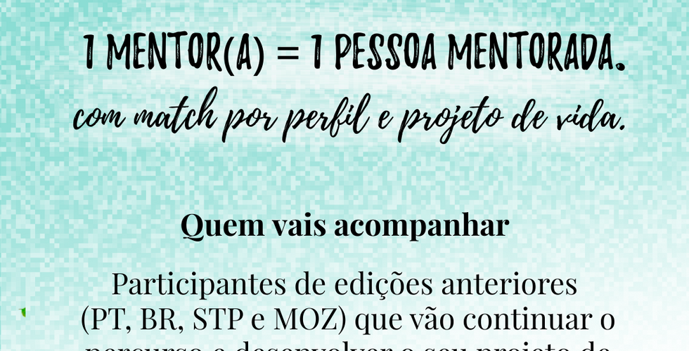 As vagas para mentores/as não exigem participação prévia em edições anteriores do Programa. No entanto, todas as pessoas mentoras selecionadas participarão numa sessão de formação e integração obrigatória, de forma a garantir alinhamento metodológico, ético e operacional.